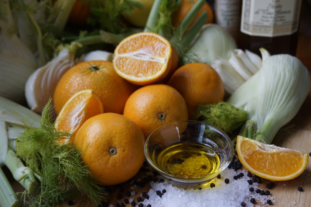 Cut the fennel first in half and then into thin slices. Cut an orange in thin rounds. Set aside.