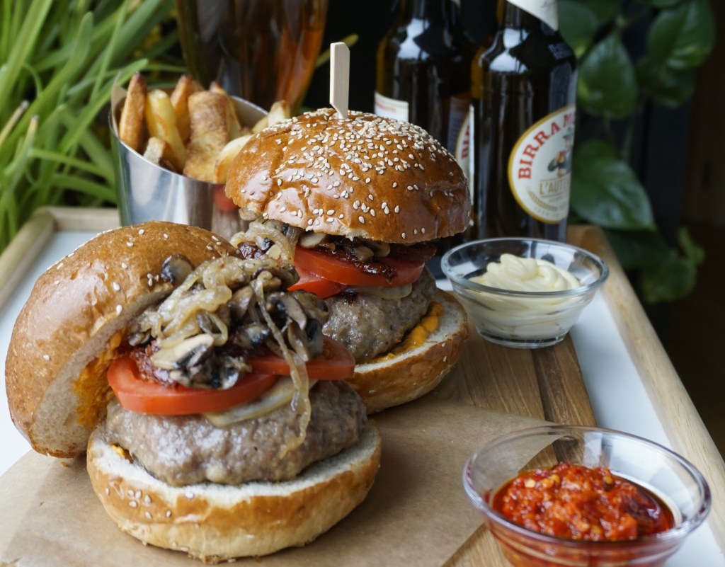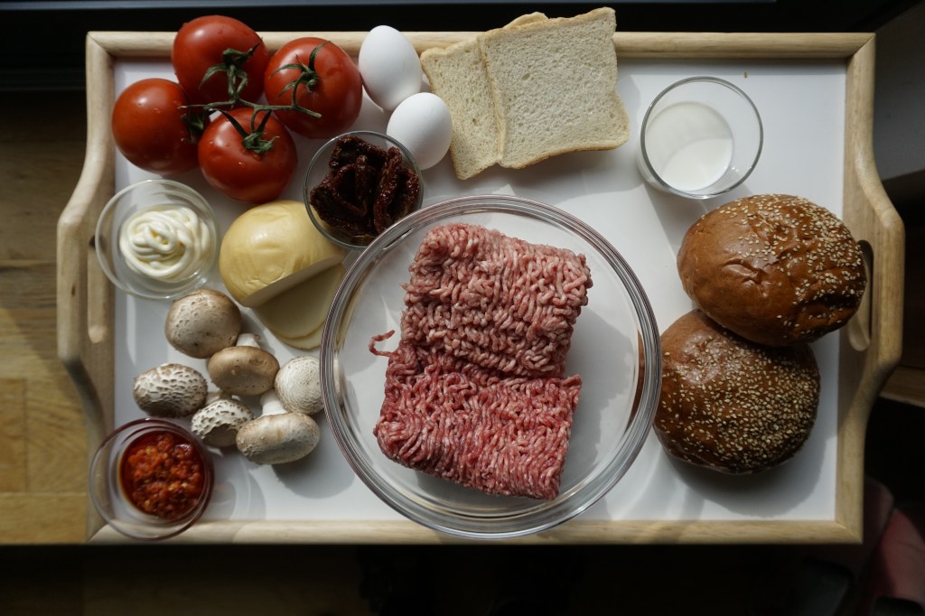 - Spread the spicy mayo inside both halves of the buns. Top with meat patties and add the sautéed mushrooms, sundried tomatoes and fresh tomatoes before serving.