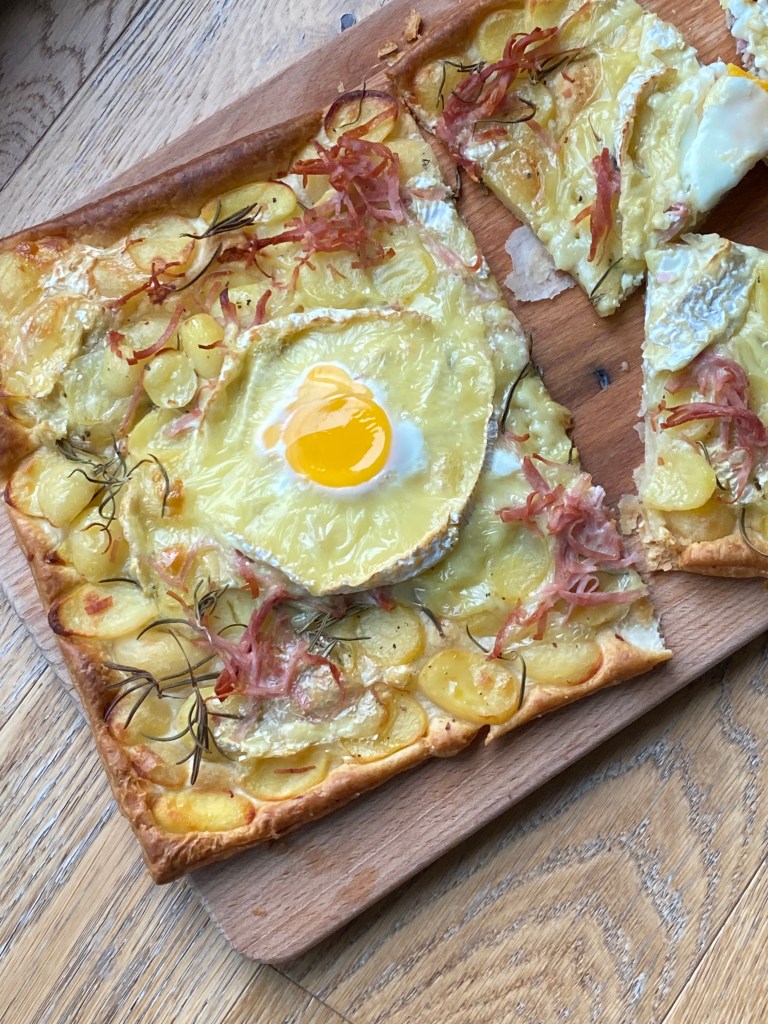 Remove the pizza from the oven and place the two rounds of Camembert, skin facing down, on the pizza and fill each whole with an egg yolk.