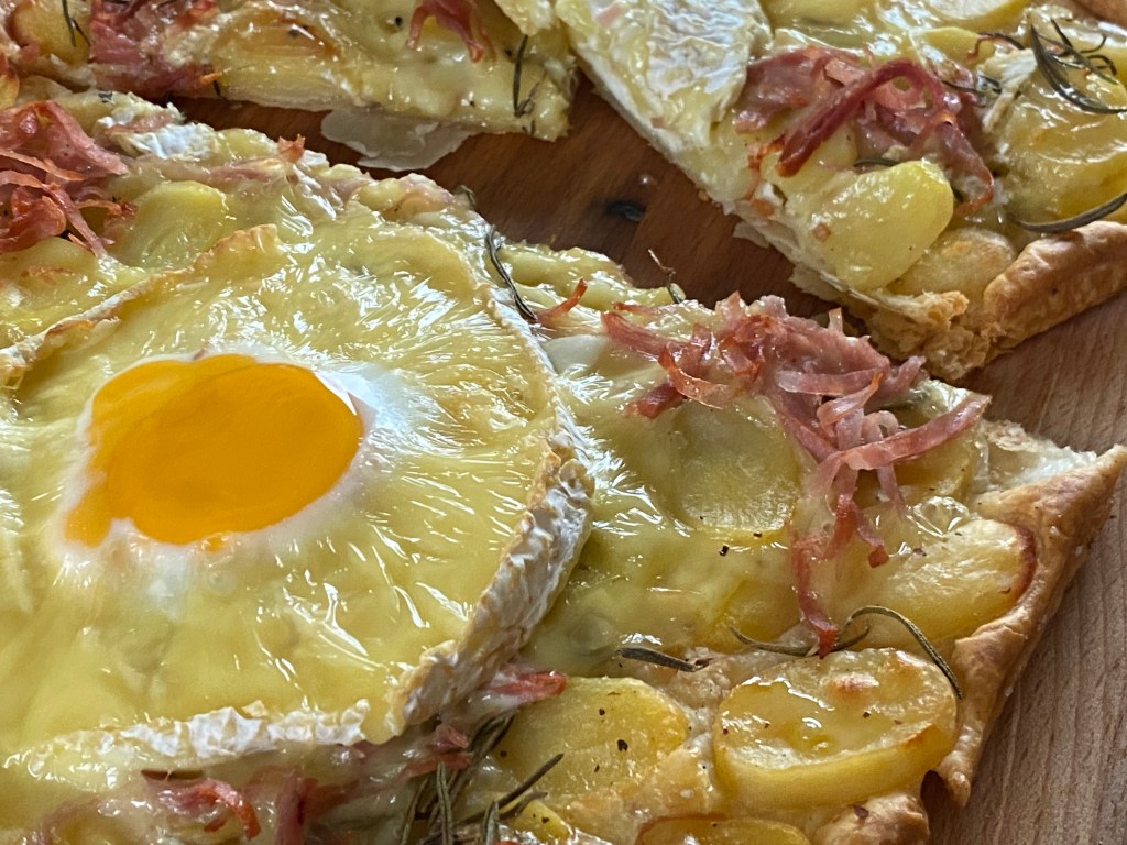 Filo sheets can prove very useful when one doesn’t have time to raise his own pizza dough. Quick and easy, this filo dough pizza recipe is inspired from the classic “pizza con patate”. I used some Camembert cheese, which I have hollowed to bake two eggs, along with some ham cut into thin slices, to make this pizza a little more protein-packed.