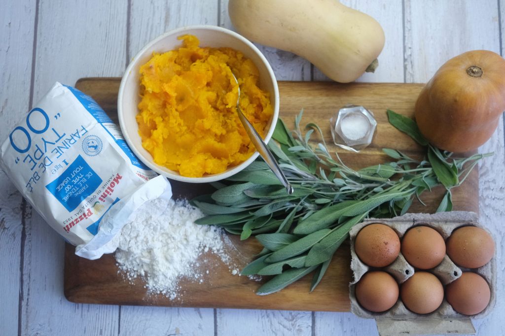 Scoop the pumpkin pulp from the peel and mash it with a fork or a potato masher. Collect the pumpkin purée on a work surface. Add the egg, a pinch of salt and mix with a fork. Then add the flour.