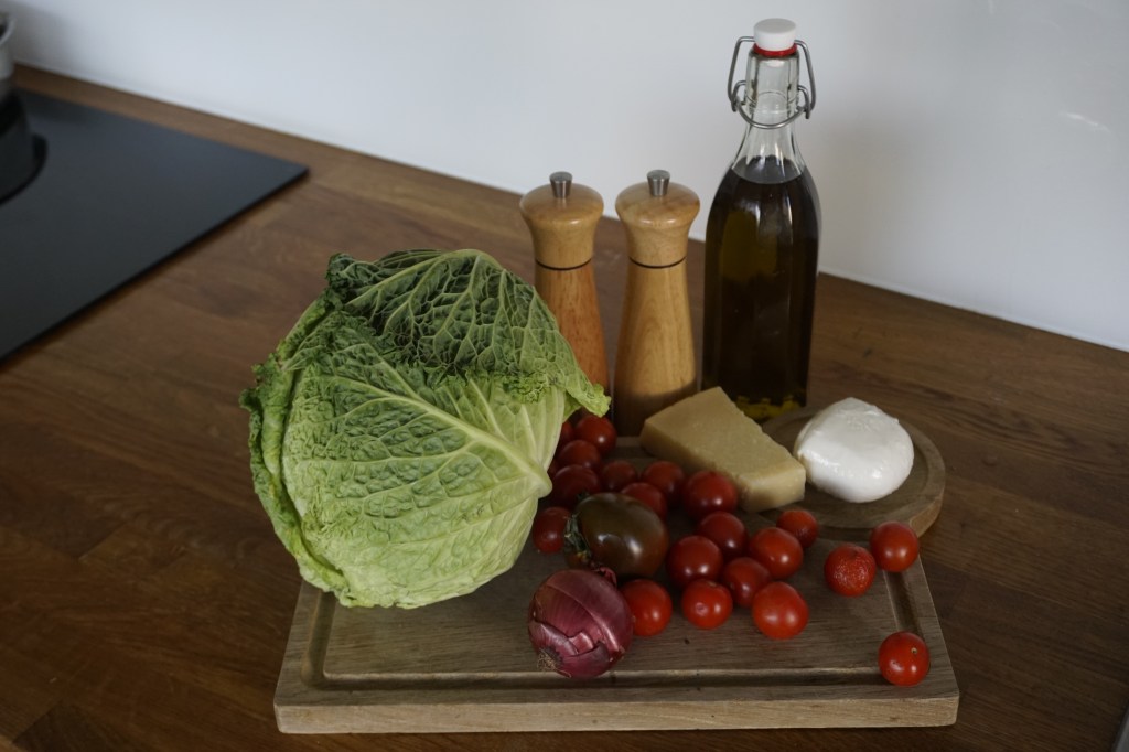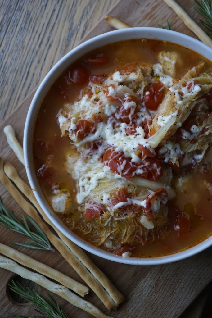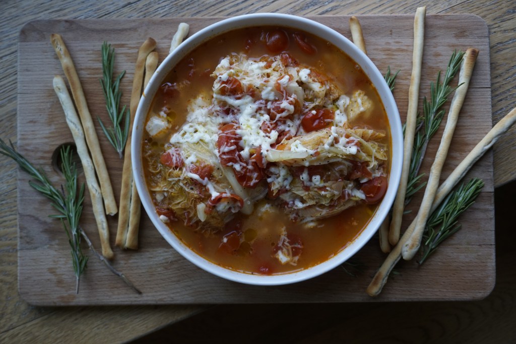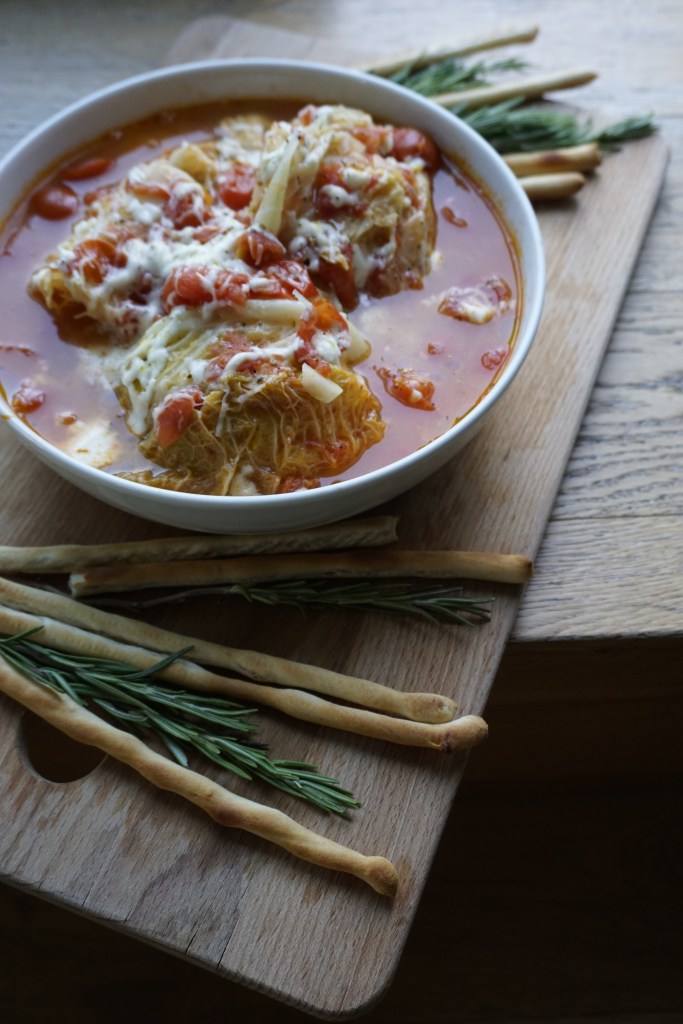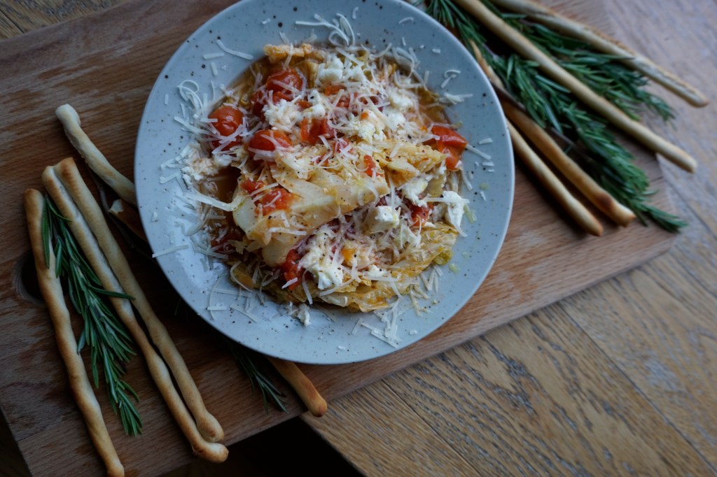 Cabbage is one of those underrated vegetables. Though most people don’t know how to prepare it, it can be a delight when cooked properly. This delicious, easy vegetarian dish inspired from my nonna’s recipe really hits the spot. It reveals Savoy cabbage’s scrumptious crunchiness, while combining its rich umami flavour with a briny tomato sughetto (broth). Topping this cabbage recipe with grated Parmesan and mozzarella makes a beautiful presentation that might even tempt your kids.
