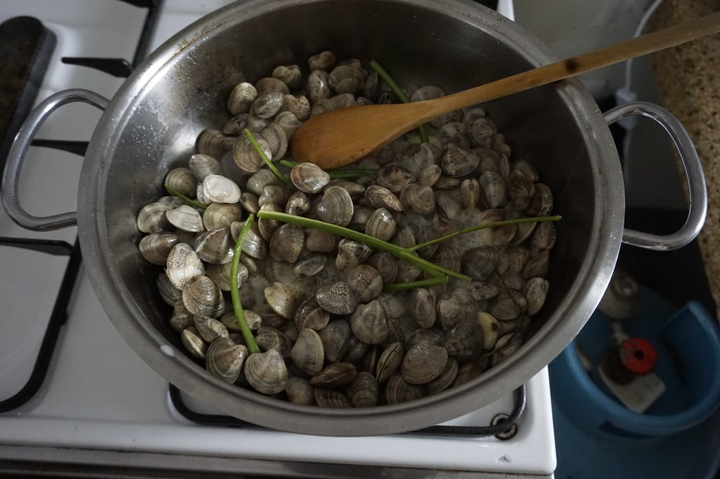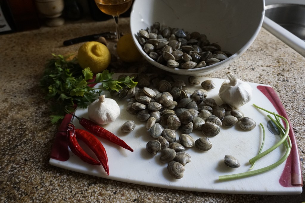 In a large pan, add olive oil, garlic and 3-4 stalks of parsley. Add chili pepper if you like it spicy. Cook at medium-low heat. After one or two minutes, toss in clams, increase heat to medium-hi and cover with a lid until all clams are open. This should take about 5 to 8 minutes. At this stage, some people ad a glass of white wine to get extra liquid and additional flavours.