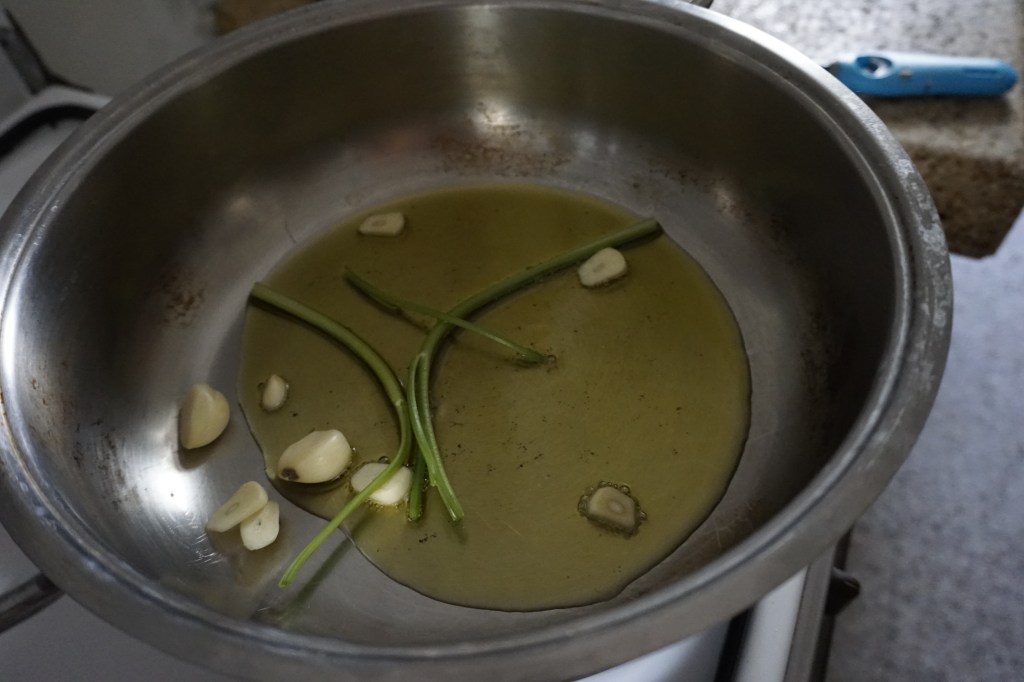 Heat some extra-virgin olive oil in a pan with garlic and finely chopped parsley. Add half of the filtered clam cooking water.