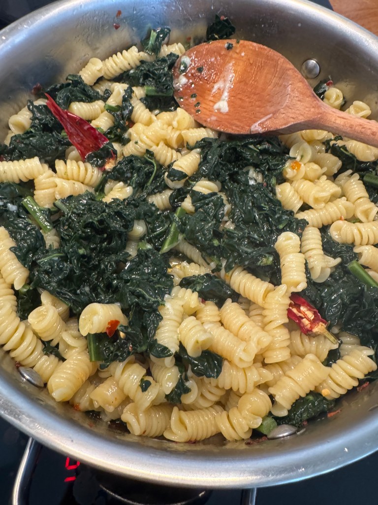 Add the drained pasta and cavolo nero to the skillet. Toss to combine. Stir in the grated cheese, and reserved pasta water if needed. Season with salt and pepper to taste.