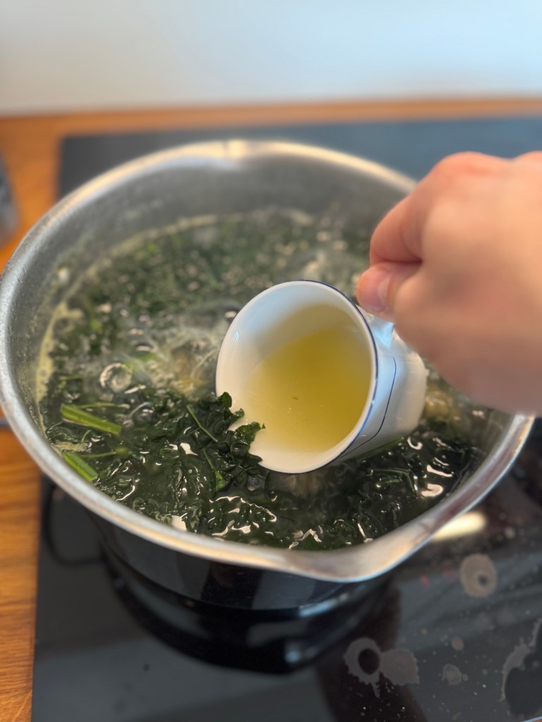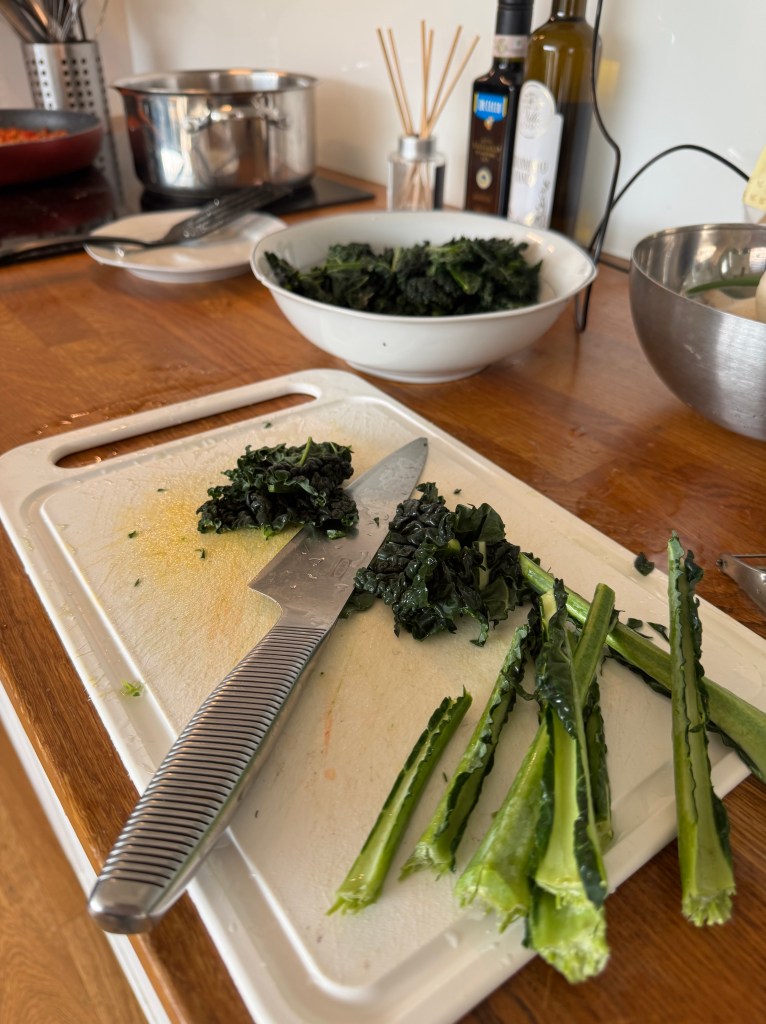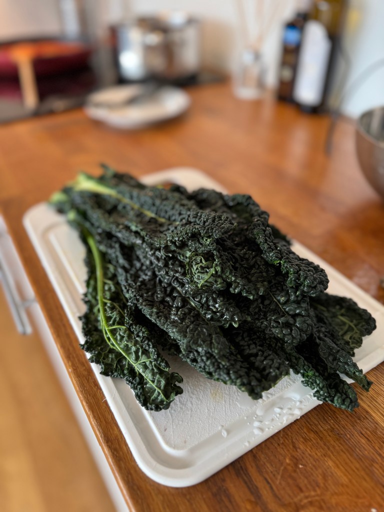 Clean cavalo nero under running water, remove hard stalks and chop roughly.