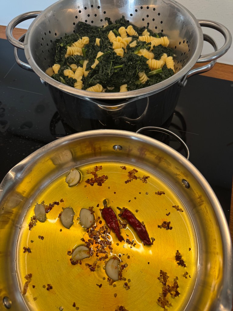 Bring a large pot of salted water to a boil. Add cavolo nero and boil for 10 minutes before throwing in the pasta and cook until al dente, like with pasta con cime di rape. Reserve 1 cup of pasta water before draining.